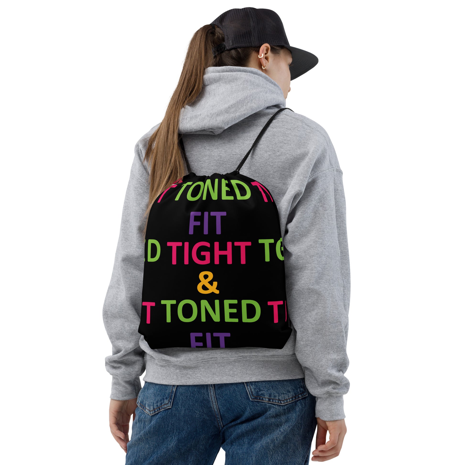Therefore, while you're out reaching your health, fitness or lifestyle goals, carry our must-have trendy "Fit, Tight and Toned," women's fitness bag that can be worn as a backpack with drawstring closure at top, and narrow, contrasting shoulder straps.